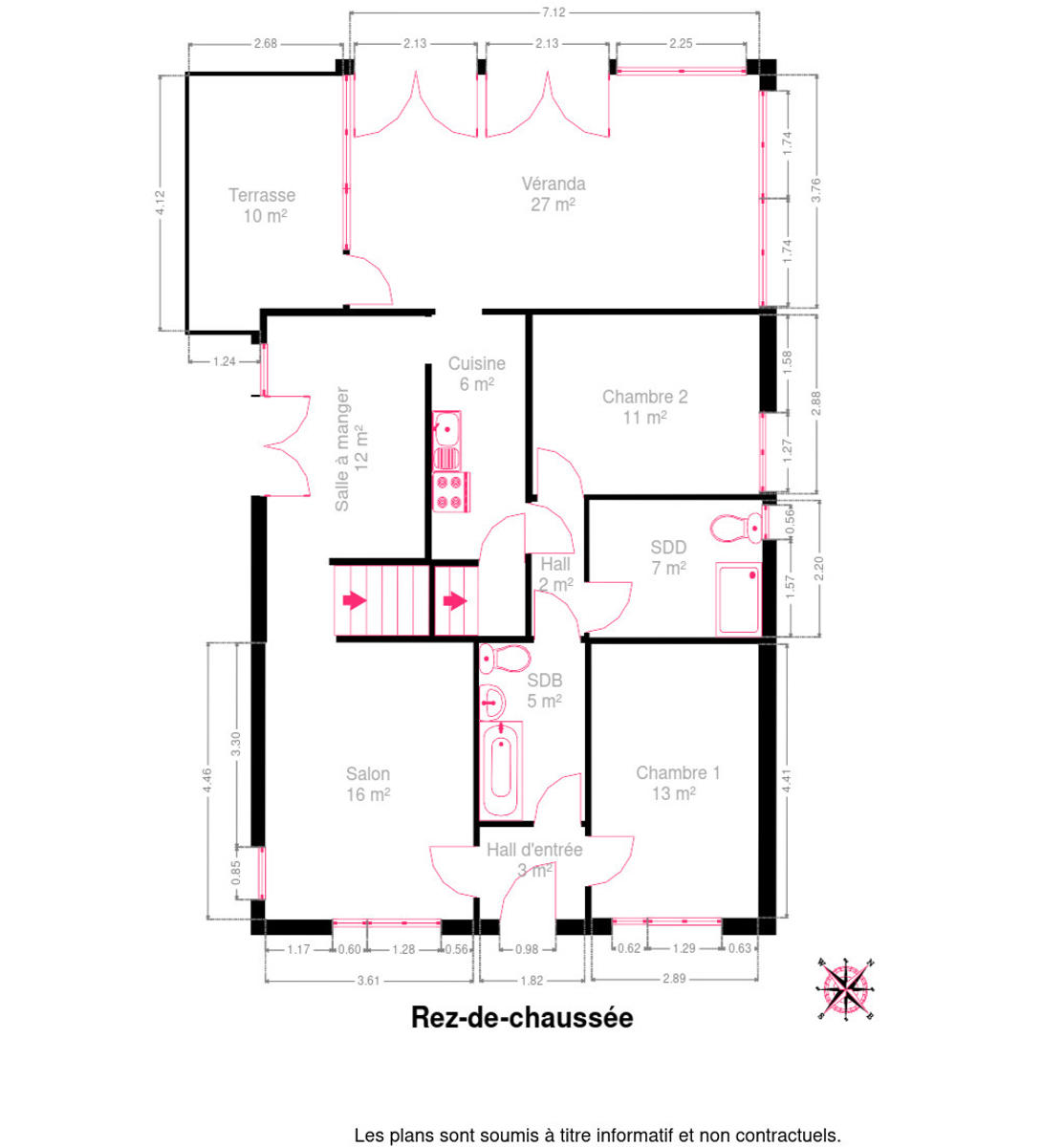 RDC; hall d’entrée, salon, salle à manger, cuisine, véranda, hall de nuit, 2 chambres à coucher, salle de douches avec w.c., salle de bains avec w.c. .