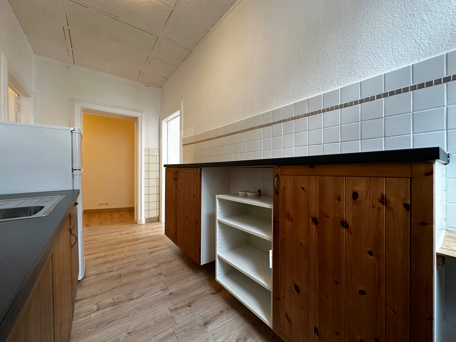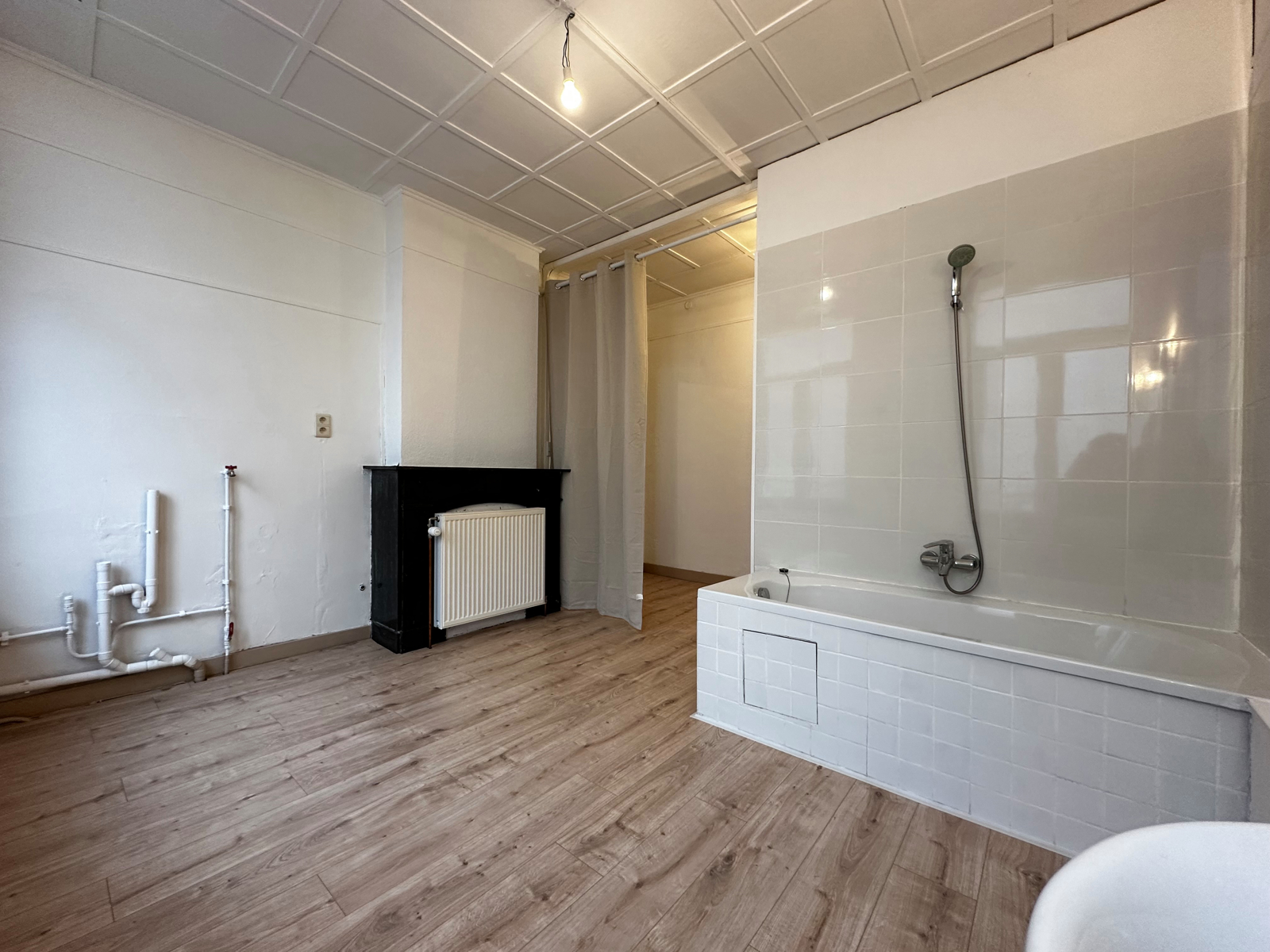 Composition : Hall, séjour partiellement ouvert sur une cuisine semi-équipée, wc, 1 chambre, salle de bains avec espace buanderie et cave.