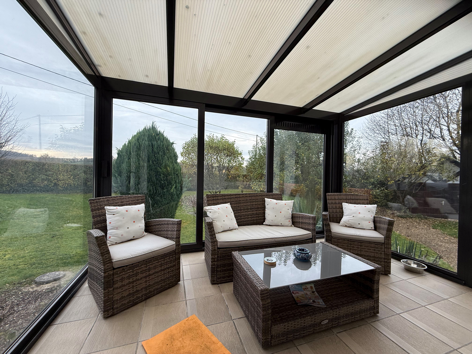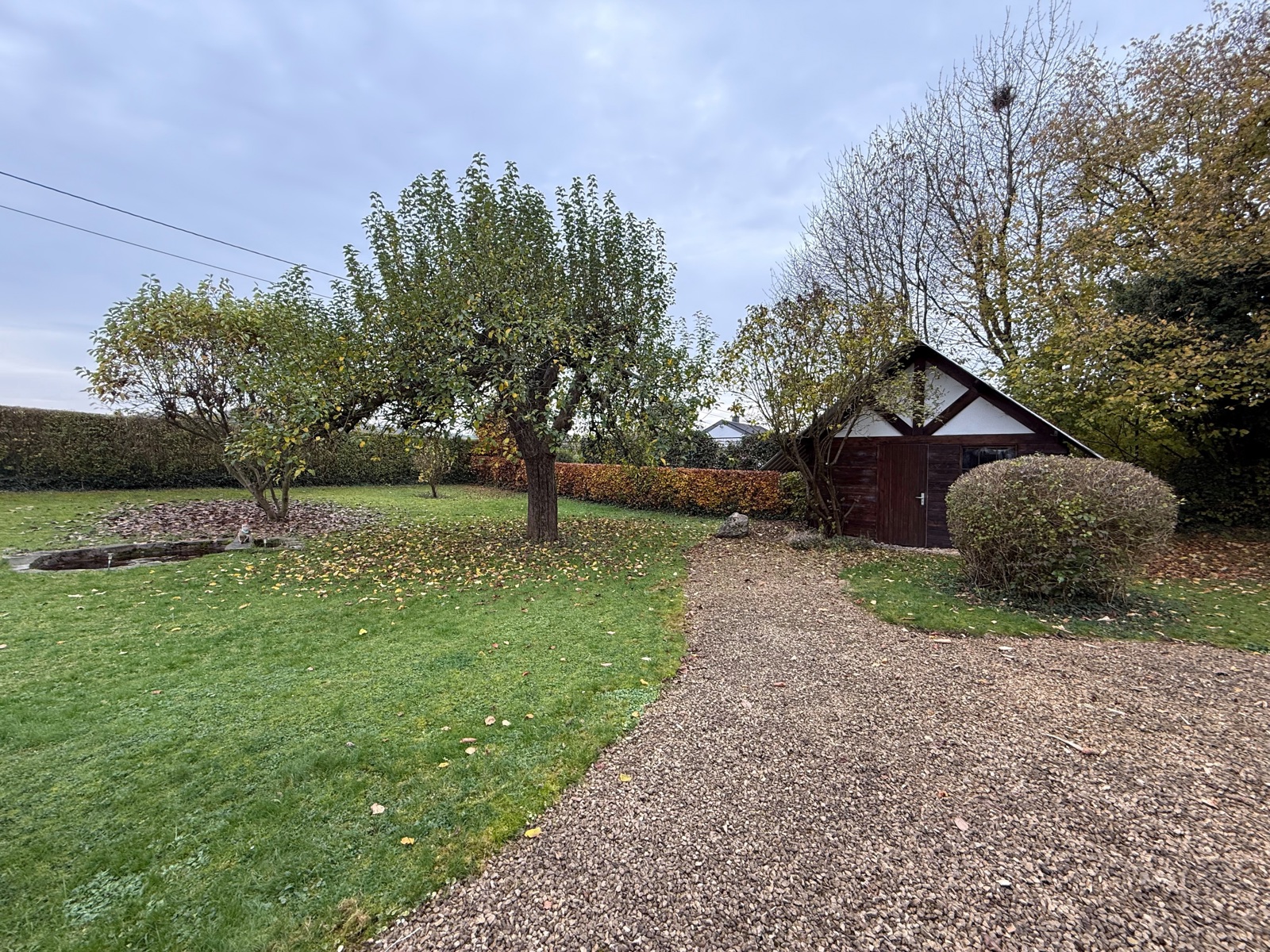 Composition : veranda, séjour, cuisine équipée, une chambre à coucher, salle de douches, grand jardin avec abris et étang.