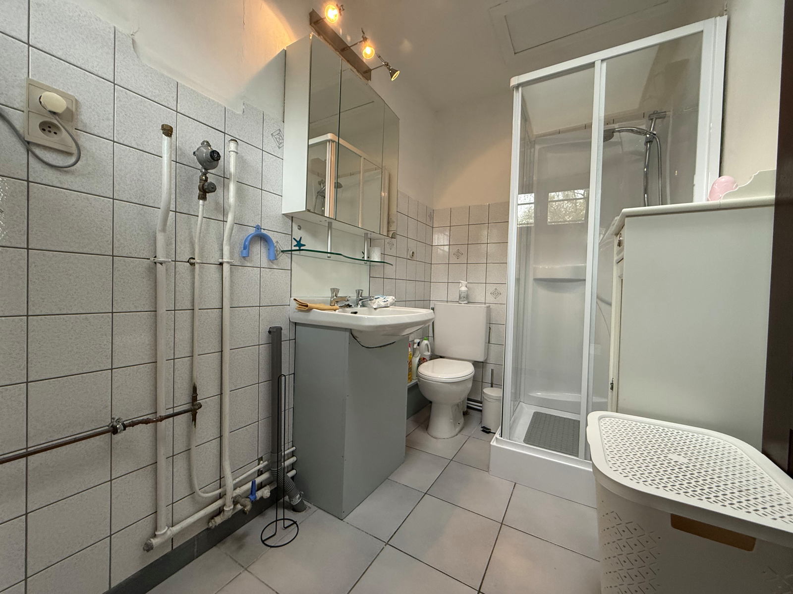 Spécificités : revêtement des sols en carrelage et parquet stratifié, chauffage central et production d’eau chaude par chaudière mazout, châssis bois double vitrage, compteurs eau et électricité, câble coaxial (Tv) et 4 paires (Tél).